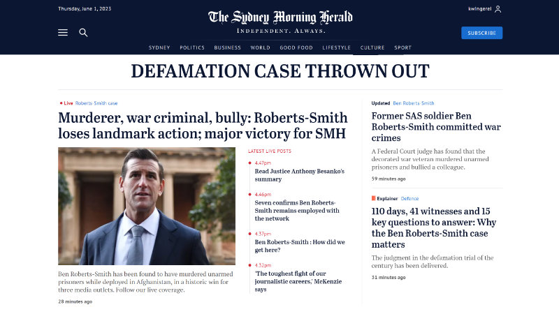 Defending defamation cases in Australia is hard. The law favours the defamed, the truth defence a high bar to hurdle. Especially when the litigant is backed by a billionaire. The court has yet to decide on who will pay for it all, and, of course, Roberts-Smith may well appeal. No doubt his chief financial backer, Kerry Stokes, will have a say in that decision.