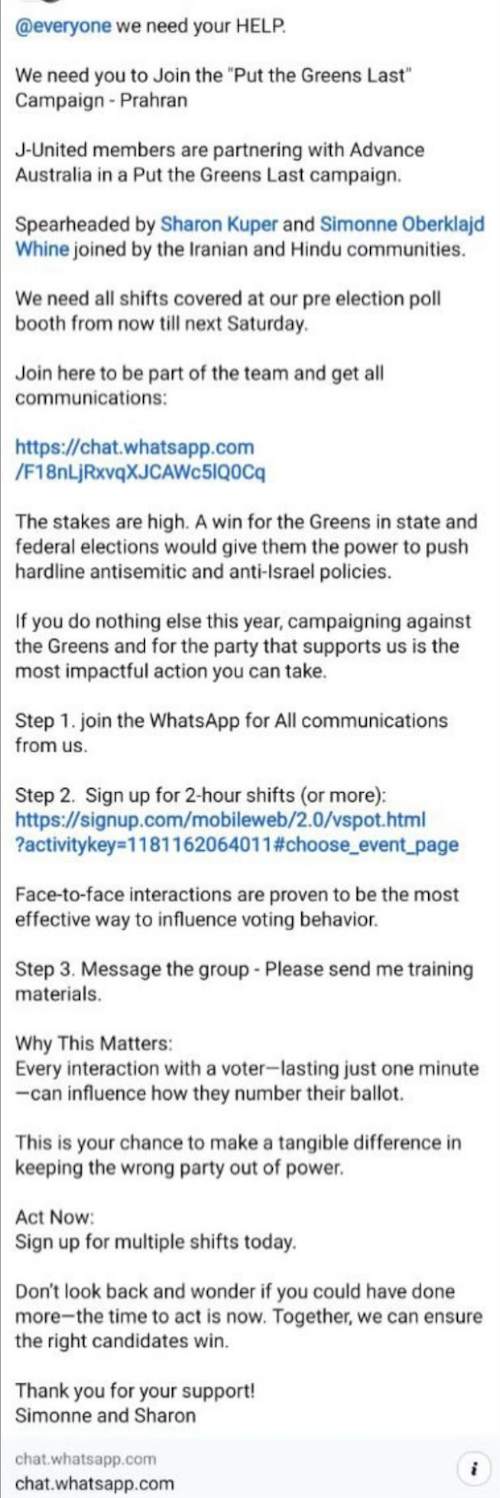 The lack of transparency surrounding a large portion of their funding and their strategic targeting of specific political parties and candidates highlight the potential impact of Advance Australia on the future of Australian democracy. And the question of foreign interference is likely to arise as per the “anti-Israel” platform revealed in the group chat above.