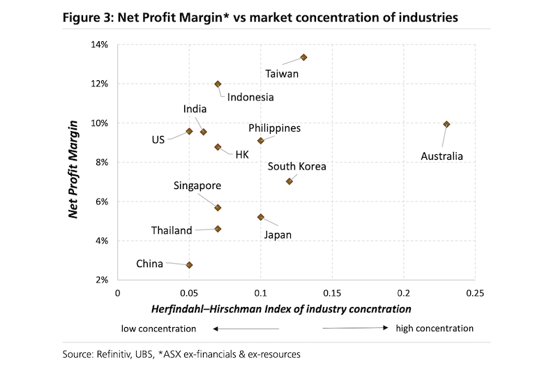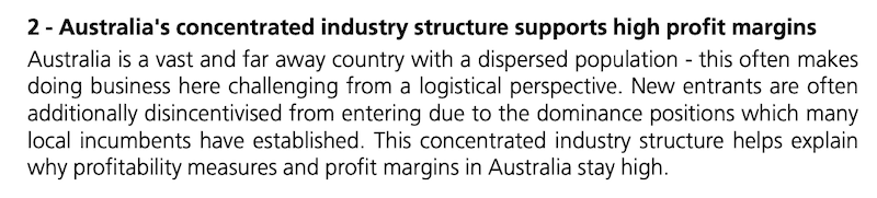 UBS analysis highlights four reasons Australia is good for foreign investors: fast population growth, high dividends, relative detachment from global economic cycle and a concentrated industry structure: “For consumers the outcome of this is bad, i.e. less choice and expensive prices. But for the businesses that are already here, this is great, i.e. less competition and higher margins”.