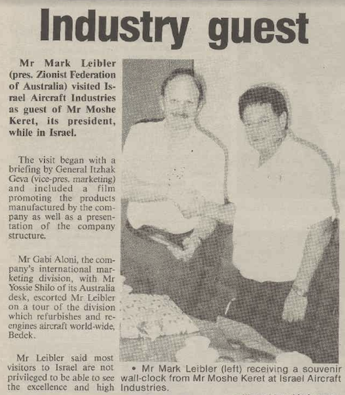 As IAI was gaining a foothold into the Australian and Pacific market, Mark Leibler and Pearl Lipshut wearing their Zionist Federation of Australia hats were busily engaging with politicians of all persuasions in Australia and Israel – successfully pushing pro-Israel policies.