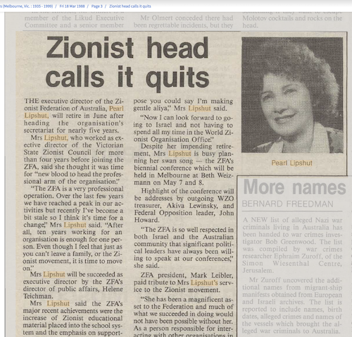 The longstanding working relationship between Mark Leibler and Pearl Lipshut ended in July 1988. The presidential and executive director team had been together for 8 years, spanning two Zionists organisations – the State Zionist Council of Victoria and the Zionist Federation of Australia.
