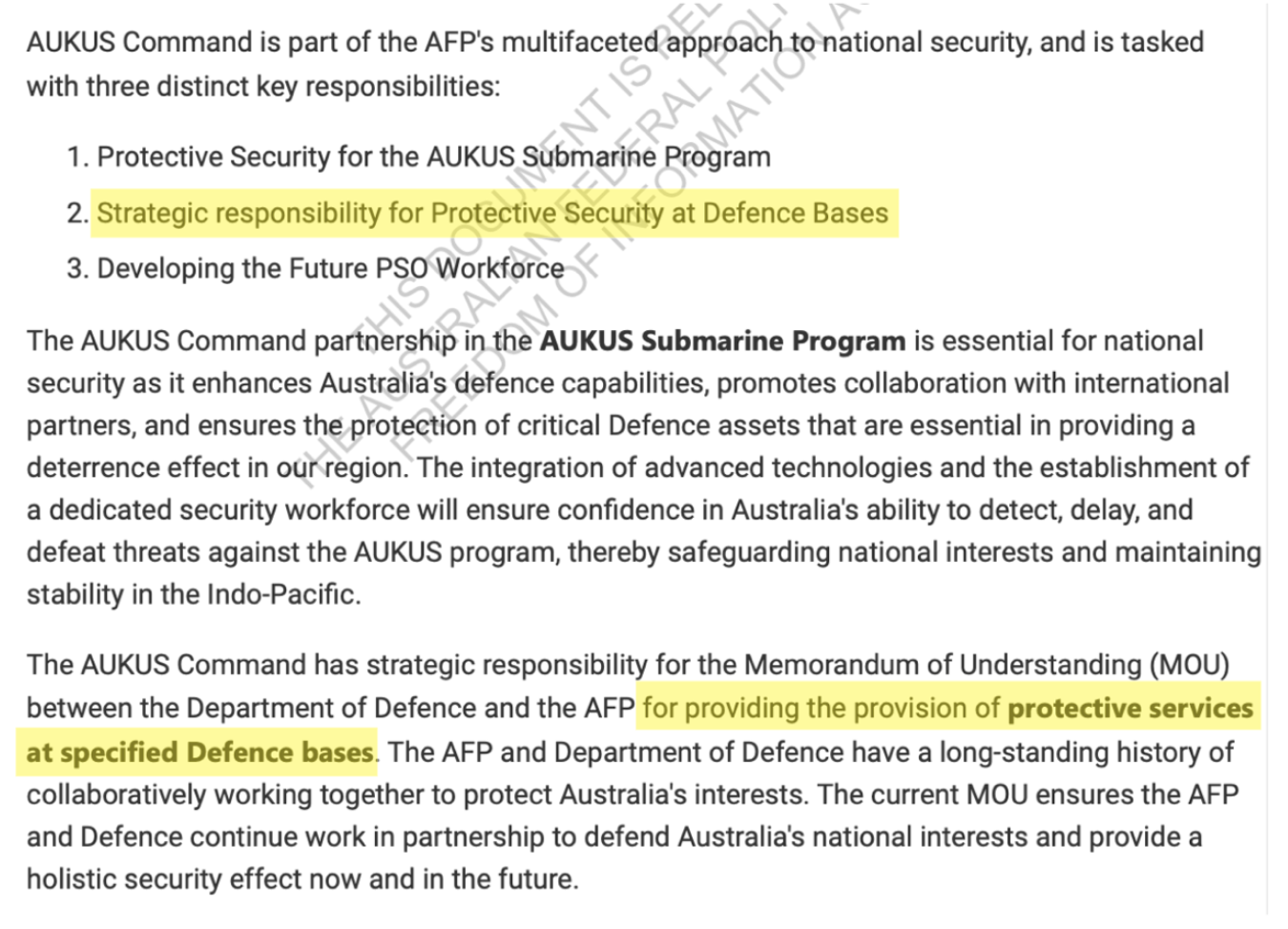 The previously secret AFP documents released under FOI show that the AFP AUKUS Command will have strategic responsibility for delivery of protective security services to “specified Defence bases) under the Defence MOU, with a significant focus on building and supporting a future-ready Protective Security Officer workforce.