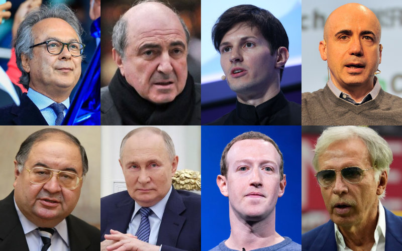 * Spot the oligarch: Top row, from left to right: Fahrad Moshiri, Alisher Usmanov, Pavel Durov and Yuri Milner. Bottom row, from left to right: Boris Berezovsky, Vladimir Putin, Mark Zuckerberg and Stan Kroenke.