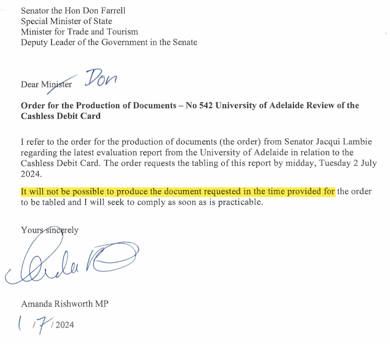 On Tuesday 2 July, Minister Amanda Rishworth advised the Senate that she was “unable to produce the document requested in the time provided”, whatever that meant. Perhaps email was down?