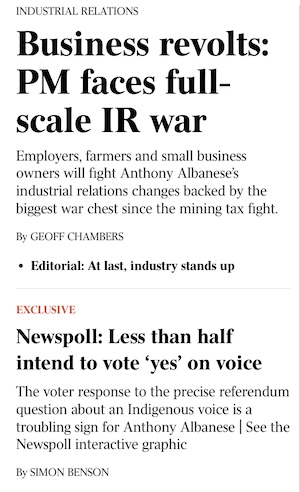 It was interesting to see how sophisticated the business PR sorcerers are these days. They leaked their “war” to friendly journalists in The Australian and AFR yesterday, who duly splashed their front pages with the war this morning. How they love a war.