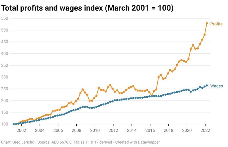 The Pandemic has laid bare what is really going on, as has the plight of Qantas, the soaring energy prices thanks to MNC gas cartel. What we have now is not the primacy of markets, it is the primacy of crony capitalists. The business lobby continues to beat down wages and taxes but big business – thanks to lobbying and political donations – but large corporations are now fused with governments like never before, fused to the point where wages are being crushed, while corporate profits are astronomical (even though most of the money in dividends, interest and capital returns from our minerals wealth flows offshore).