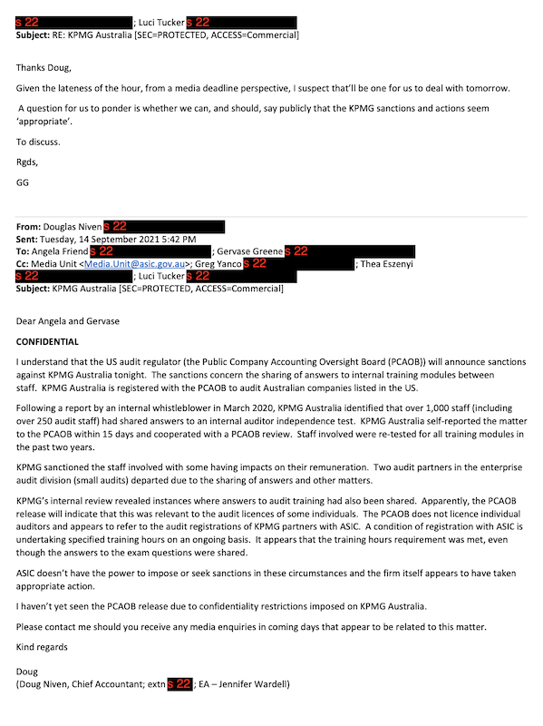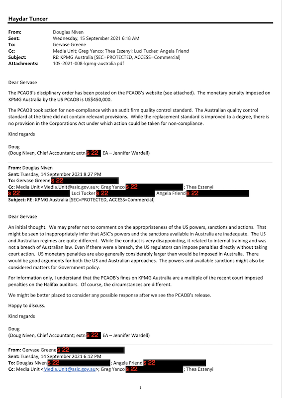 The FOI document indicate that: (1) ASIC did not inform the Parliamentary Committee; (2) ASIC did not undertake its own investigation but accepted that KPMG could manage the investigation and any penalties itself; (3) ASIC met with representatives of KPMG Australia and prepared notes that provide an incomplete record about what had happened at KPMG and how KPMG was handling things; and (4) ASIC let the PCAOB, a regulator in the United States – in another country or jurisdiction – do its job of enforcement against auditors at KPMG Australia.
