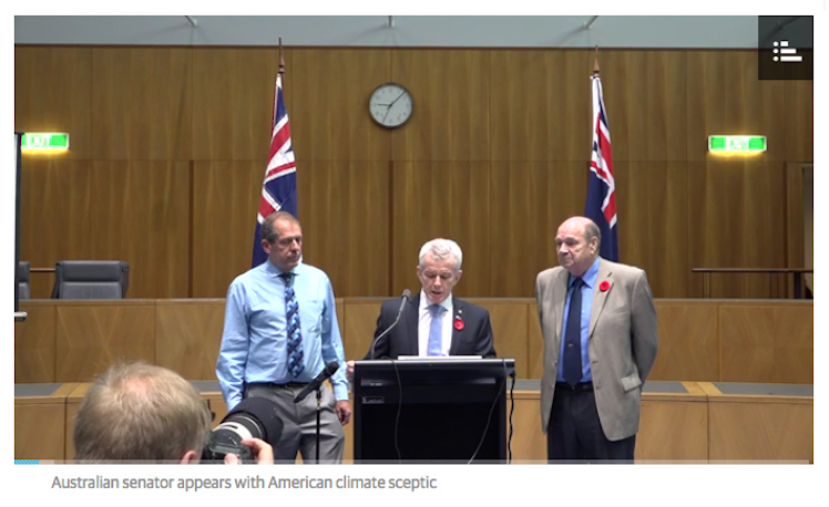 A strange inclusion in the online article was a video captioned “Australian senator appears with American climate sceptic”, about a Canberra media conference featuring One Nation Senator Malcolm Roberts. We aren’t told this, but the media conference happened eight months ago.