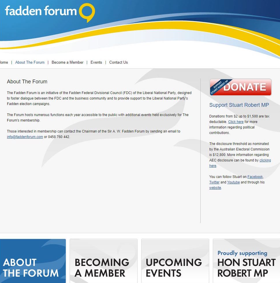 An analysis of the archived snapshots of the Fadden Forum website shows that it appears to have been tweaked between November 2014 and August 2015 to add a “Proudly Supporting Hon Stuart Robert MP” button on the front page which is in addition to the big red donation button.