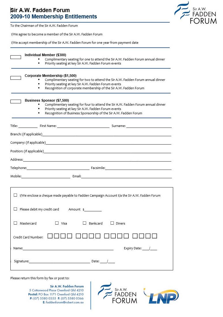 However, it can now be revealed that a “2009-10” Fadden Forum membership form offered three tiers of membership – Individual Member ($300), Corporate Membership ($1500) and Business Sponsor ($7500) – with cheques to be made out to the “Fadden Campaign Account” – and payments forwarded to what was at the time Robert’s electorate office address: 5 Cottonwood Place, Oxenford, QLD (the Fadden Forum website’s registration details still include this address as well as Robert’s parliamentary email address).