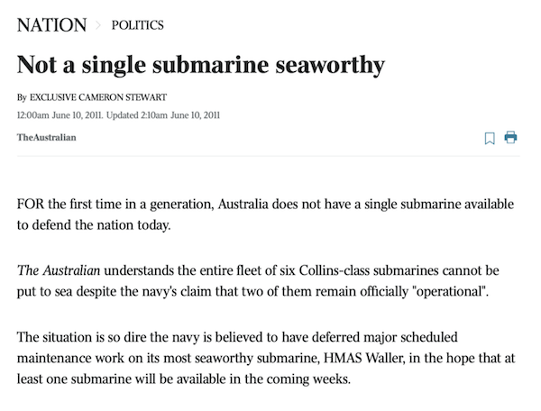 On 10 June 2011 the Government woke up to a headline in the Australian; “not a single submarine seaworthy”. Reliability issues started to plague the Collins submarines.