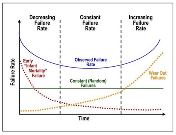 When you first buy a car there’s a risk of infantile failure of components. The warranty period covers these failures. Then the car performs reliable for the next decade until wear-out failures start to kick in. That’s the point where most people dispose of the car.