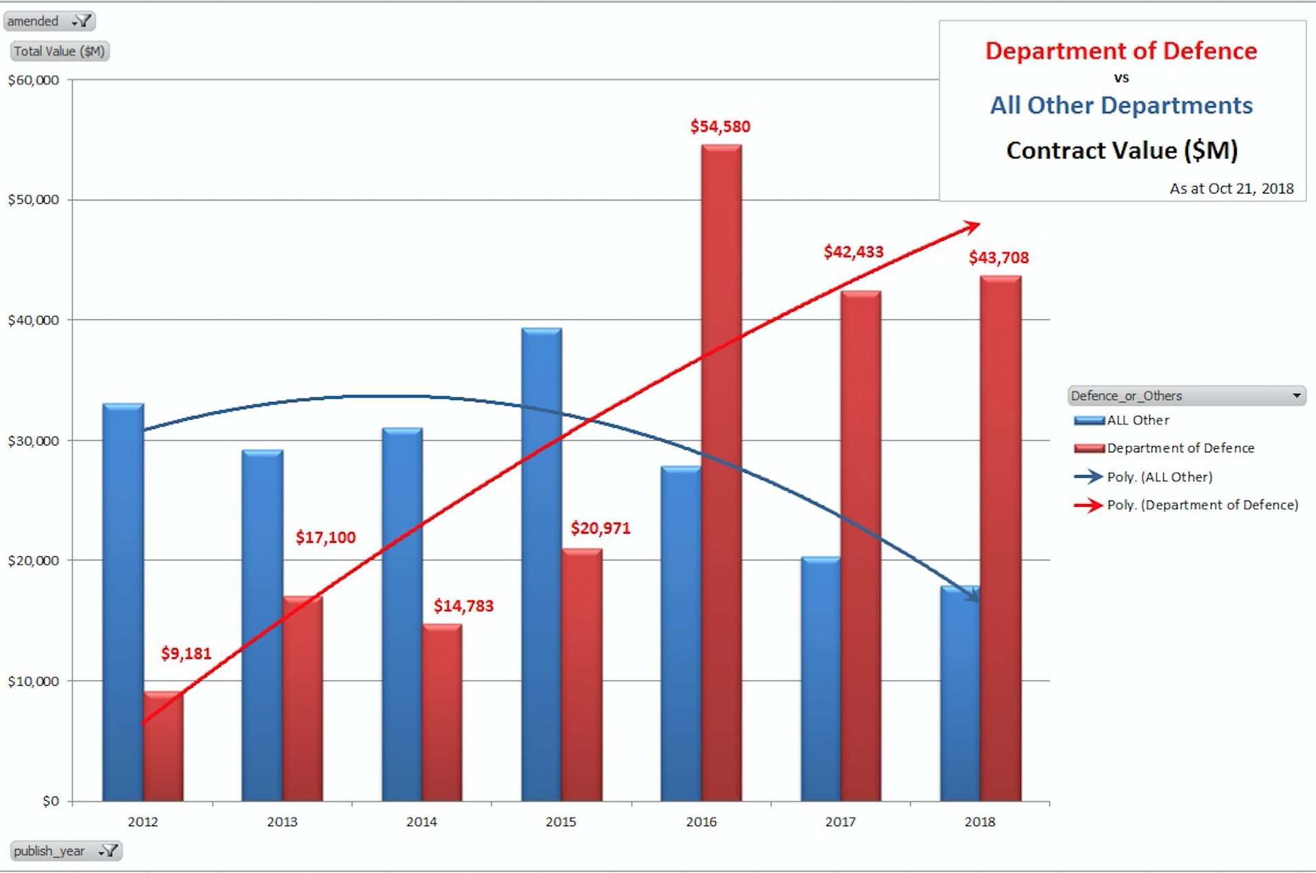 Confirming the blow-out in military spending, $43.7 billion of the $61.6 billion in contracts through AusTender in 2018 are for the Department of Defence.