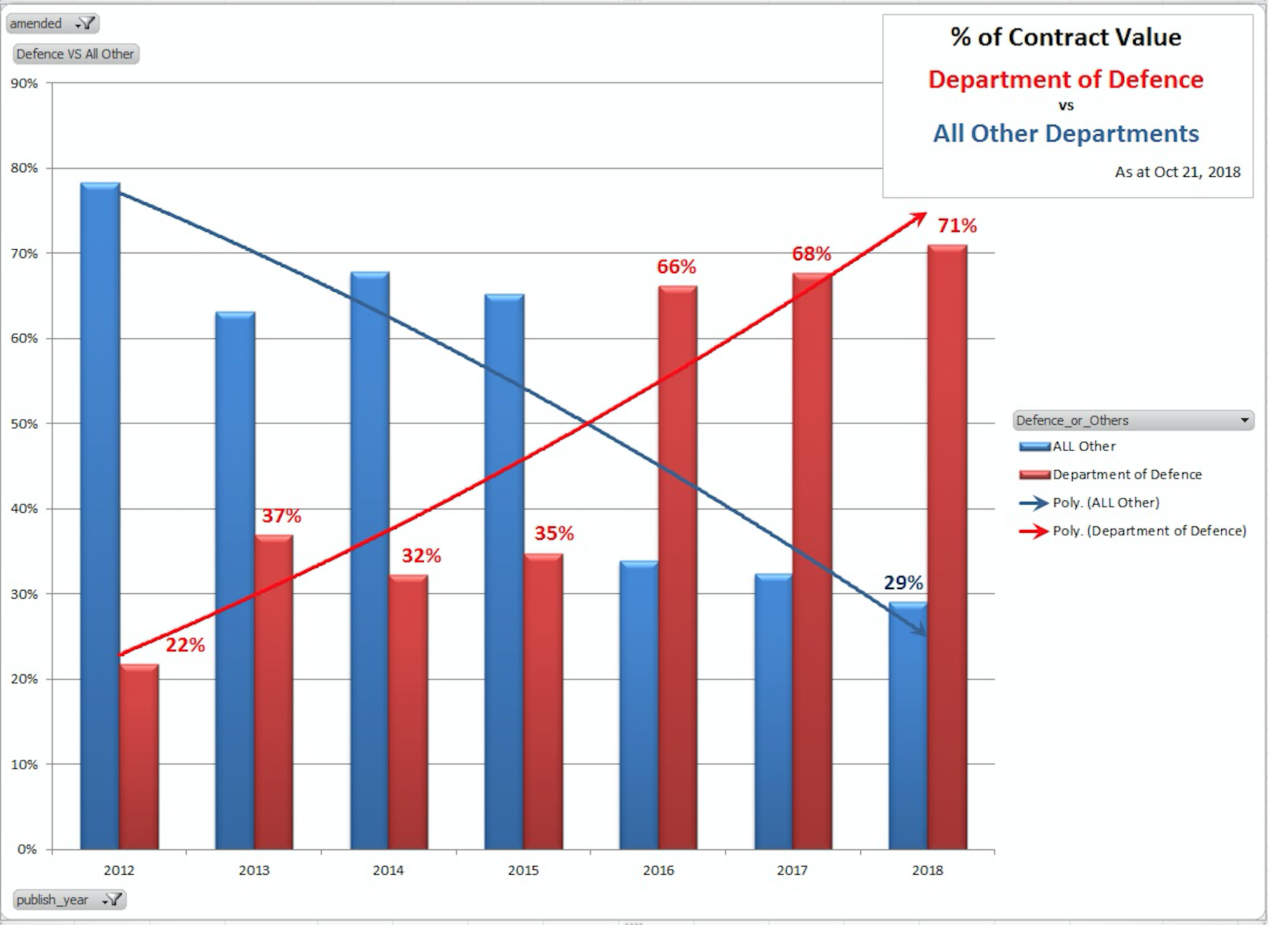 The following table shows that seven years ago, defence spending represented just 22 per cent of all government spending on procurement. This year it stands at 71 per cent.