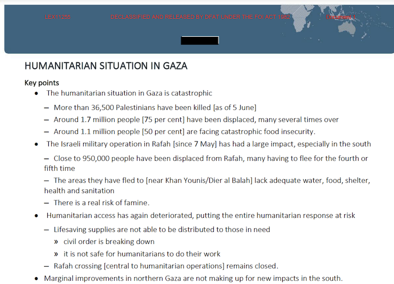 It reads like a litany of war crimes. We have published it below for readers’ consideration. “The impact on civilians has been immense,” DFAT advised Foreign Minister Penny Wong. “The UN reports that as of 13 May 2024, nearly 35,000 Palestinians have been killed and more than 78,000 have been injured. Of Gaza’s 2.3 million people, approximately 1.7 million have been displaced.”