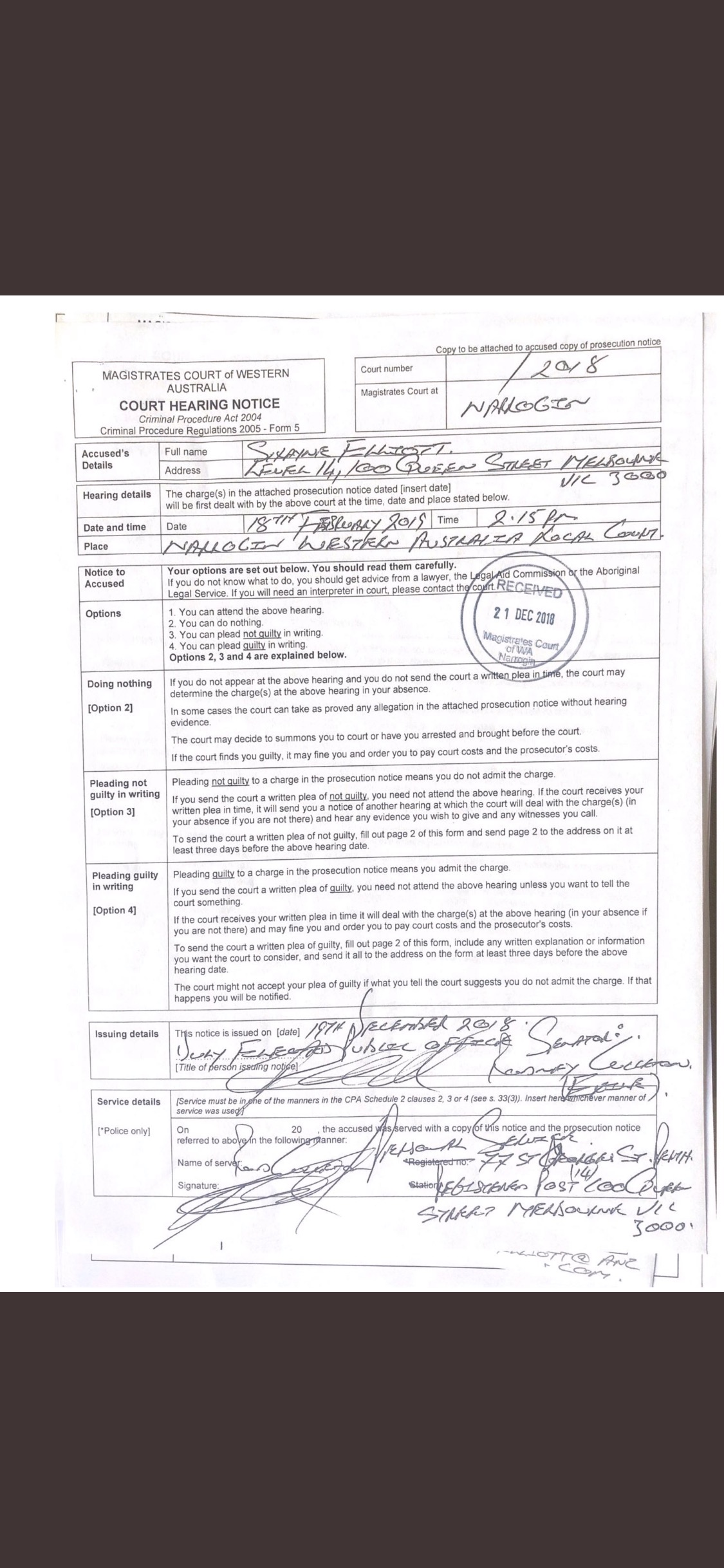 If you look closely at the lower right hand corner the the accompanying document, you will see this notice of criminal prosecution is dated December 19 and appears to have been brought by “Duly elected public officer, Senator Rodney Culleton”.