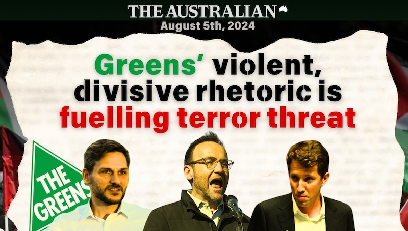 The QJC’s key message is crude: “Once a party that stood for environmental action, the Greens are now promoting terrorism in the Middle East, genocide of Jews and persecution of minorities elsewhere.”
