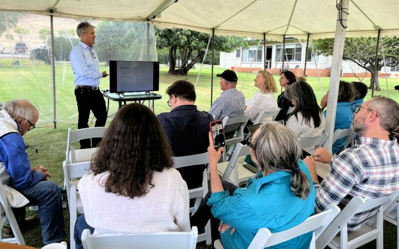 In attendance at the meeting were Teal federal members Sophie Scamps and Kylea Tink. The politicians arrived via helicopter following a tour over the Pilliga, an area of state forest which has already been subject to Santos drilling.