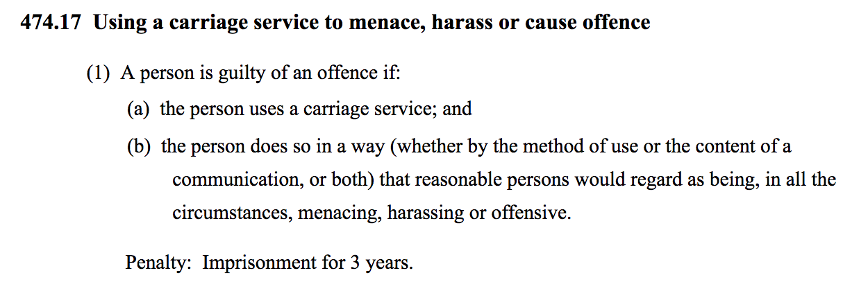 While Jono’s emails were, he claims, never more than forthright, using a carriage service to harass or menace and so forth is a Commonwealth offence which promises up to three-years in the striped pyjamas.