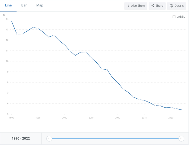 The first graph charts manufacturing as a % share of GDP. It’s shows Australia’s manufacturing base shrinking from 14% of our economy in 1990 to just 5.5% in 2022.