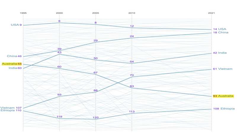 The second graph, showing economic complexity tells a similarly sad story. Economic complexity is a measure of ranges of products that a country can export and normally correlates directly with the richness of a country. Wealthy countries generally have high economic complexity. Australia, which at 93rd lies between Uganda and Pakistan, is an outlier, rich but with low complexity, thanks to the great quantities of unprocessed ‘rocks’ we export to other countries.