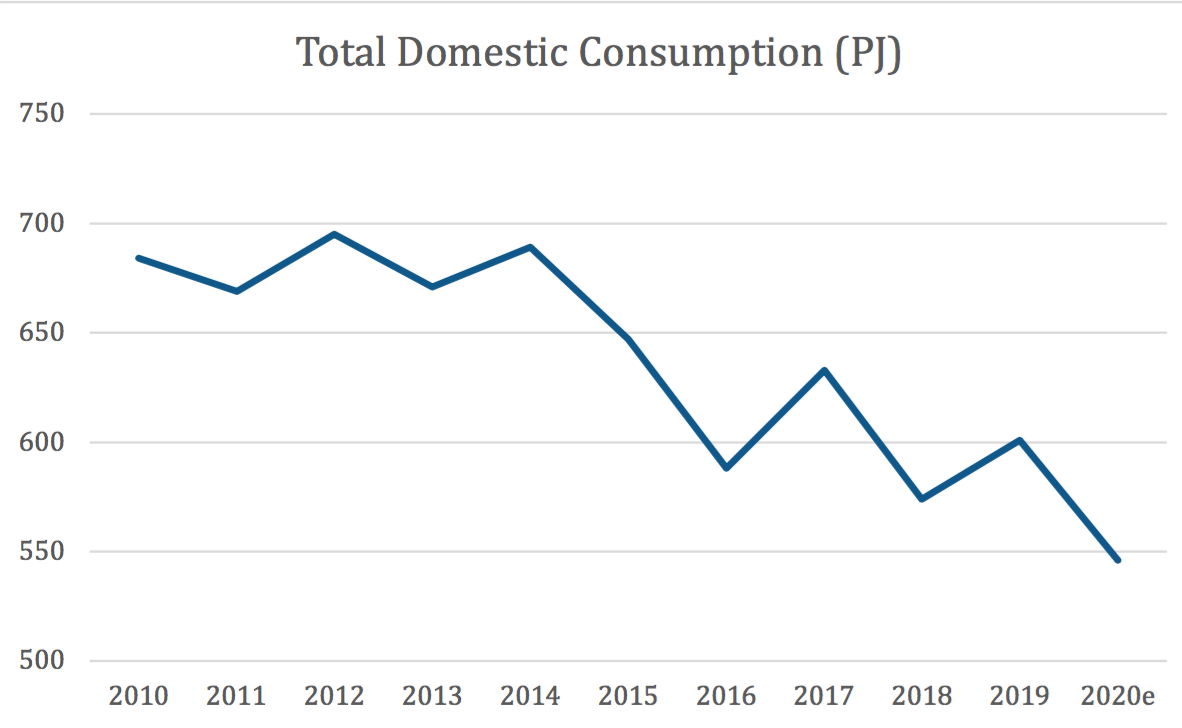 “Domestic demand is falling, despite low prices, and is destined to fall further and faster due to the global gas supply glut and the flattening of international prices.” The graphic below tells the story. If this chart shows “relatively flat demand” then Santos has a funny idea of what constitutes “flat”.