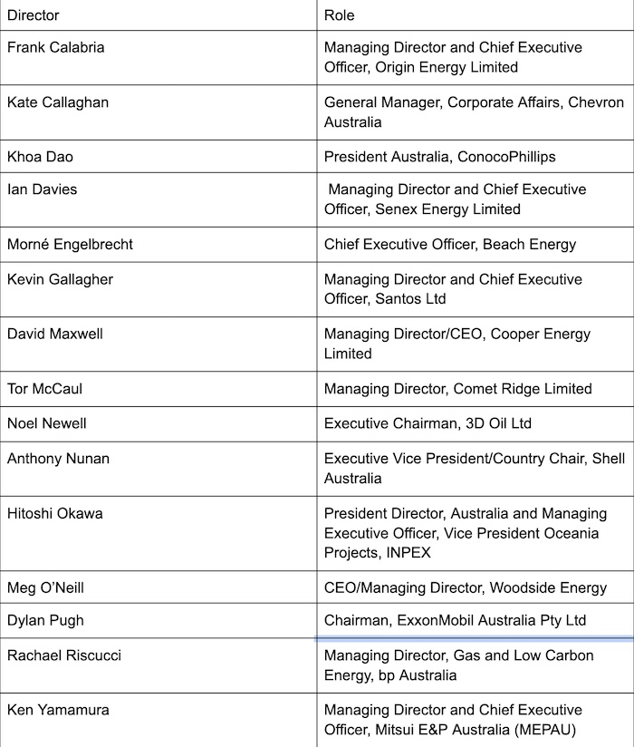 They include Frank Calabria, CEO of Origin Energy, Kate Callaghan, former Kevin Rudd advisor and general manager of corporate affairs at Chevron Australia, Khoa Dao, President of ConocoPhillips Australia, Kevin Gallagher, CEO of Santos, Dylan Pugh, Chairman of ExxonMobil Australia and Meg O’Neill CEO of Woodside Energy among others.