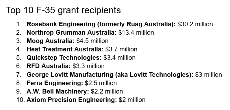 Other major recipients include Moog Australia, Quickstep Technologies and Ferra Engineering, alongside a network of specialist manufacturers.