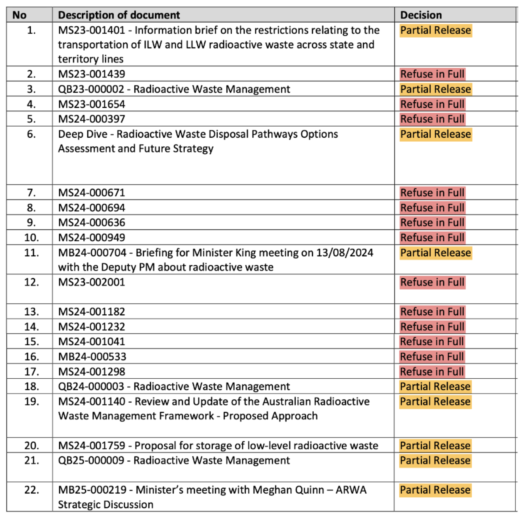 21 documents; 9 partially released (but full of redactions) and 13 completely refused.