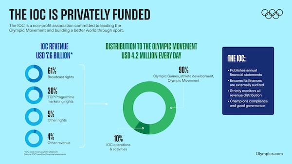 The International Olympic Committee is funded by multinational companies, including Coca-Cola, Allianz, Intel, Alibaba, Toyota, Visa, Samsung and Deloitte. Some 61% of its revenues come from selling broadcast rights to multinational media groups and 30% from selling marketing rights.