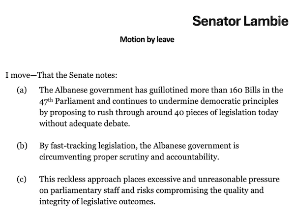 On Wednesday evening, around 7:30 PM, the Government circulated a guillotine motion. At 8:30 PM, independent senator Jacqui Lambie posted on BlueSky, alerting political die-hards that the Government had signalled ‘game on’, saying:
