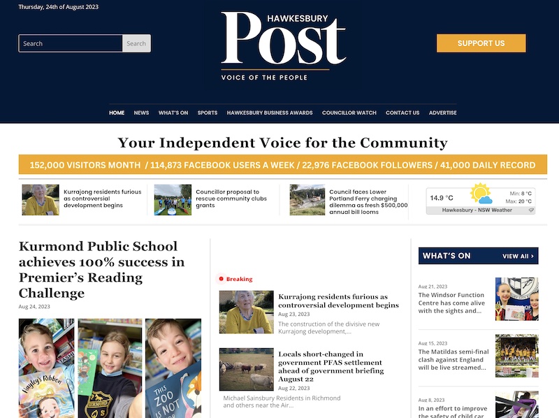 Despite the best, and worst, efforts of McMahon and Bennett, Hawkesbury locals seem to like what they are getting. The paper’s Facebook page has almost 23,000 followers – a number that climbs steadily every month. Its unique visitors numbers are running at 150,000 a month  – besting most local papers in similarly populated regions with 116% engagement, compared to an average of similar sites. Earlier this week that spiked to 41,000 unique visitors one day on the back of what Parry-Okeden says was a “bread and butter local news story.”