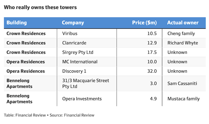 “Along Sydney Harbour, from Circular Quay to Barangaroo, a slew of apartments in the Crown Residences, Bennelong Apartments, Macquarie Apartments and Opera Residences are held by shell companies – vehicles that lawfully hide the identity of their owners.”