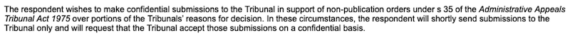 Late yesterday the Government’s lawyers made submissions to the AAT on why the decision should not be released in full, and then requested their submission also be kept secret.