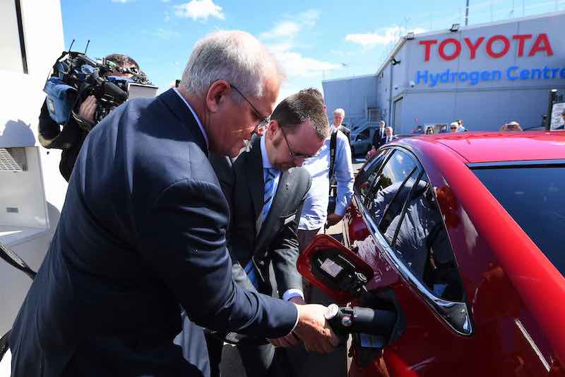 Not only has the fossil fuel industry been onboard, but so has the LNP, historic cheerleaders for the fossil fuels lobby. Scott Morrison rejected any attempt to have himself photographed with electric vehicles but seized the opportunity to be photographed with Toyota’s hydrogen car.
