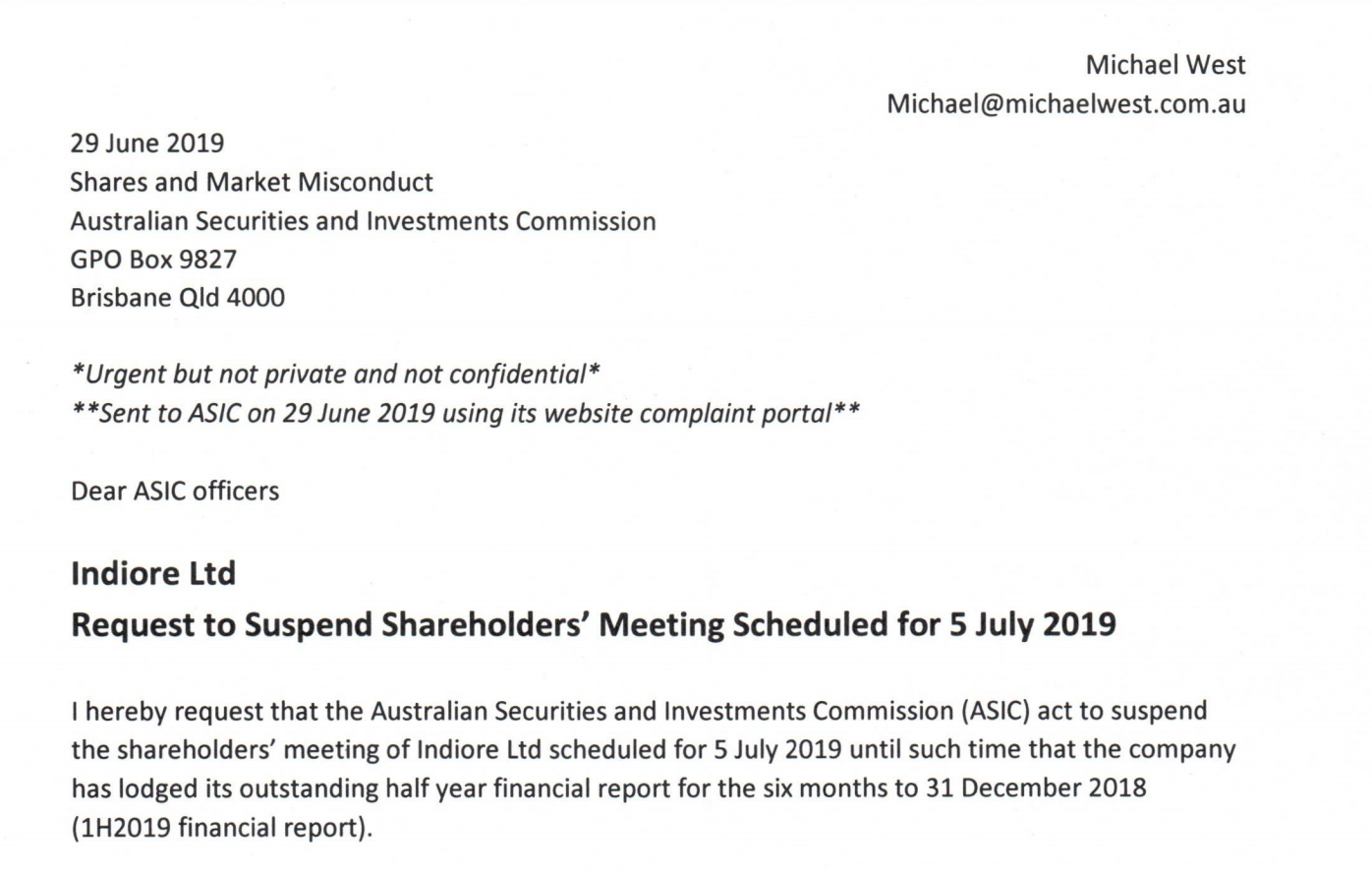 Having subsequently checked this company, Indiore, we discovered they were trying to raise money from their shareholders without producing, as is required, audited financial statements for 180 days. On behalf of Indiore shareholders therefore, we have lodged a complaints with the corporate regulator.