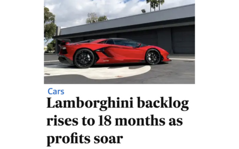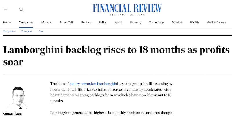 “The boss of luxury carmaker Lamborghini says the group is still assessing by how much it will lift prices as inflation across the industry accelerates, with heavy demand meaning backlogs for new vehicles have now blown out to 18 months,” said the report.