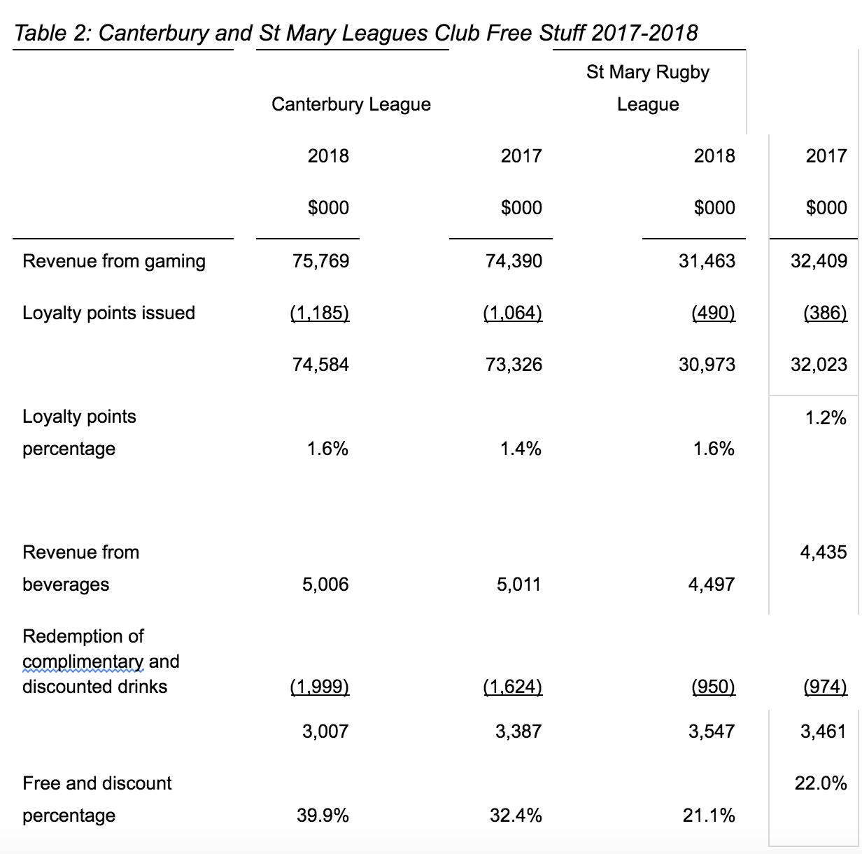 Now look at the redemption of complimentary and discounted drinks percentage in Table 2. Nearly 40 per cent of revenue from beverages for 2018 of Canterbury League is for complimentary and discounted drinks. In effect, two out of five drinks at Canterbury are served for free.