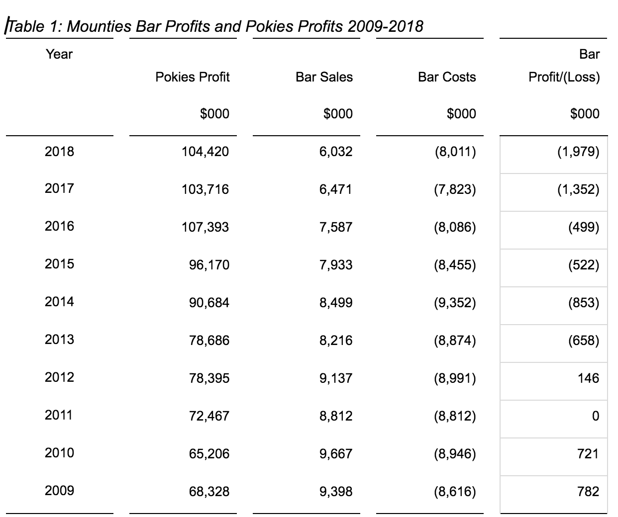 Mounties used to make profits from bar sales back in 2009 and 2010. Since then, bar trading is down 353 per cent and poker machine profits are up 53 per cent. One explanation for this phenomenon is that the bar is being used to fund poker machine profits.