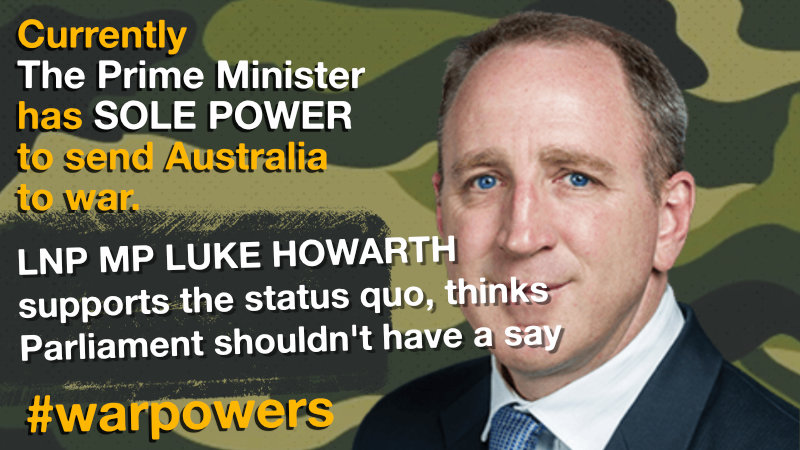 Luke Howarth: I don’t want the Greens making decisions on anything that my kids are involved with, to tell you the truth. I don’t support that at all … I think that the appropriate process is in place. There’s the executive government of the day that’s elected for a three-year term. Australians get to decide every three years at the national level whether they want that government to continue, and the cabinet …. decide on those decisions. Then you also have the national security committee, which is … the top five or so ministers with the chief of the defense force, our intelligence agencies, foreign affairs, and others that decide on that. Now putting that into context with the United States, where you’ve got a president and a commander-in-chief – one person that decides whether they go to war – I think the Australian model works pretty well … The government of the day makes that decision and they’re accountable to the people every three years on that, so I support that decision … I think the cabinet process works well, so I’m not in favor of changing it.