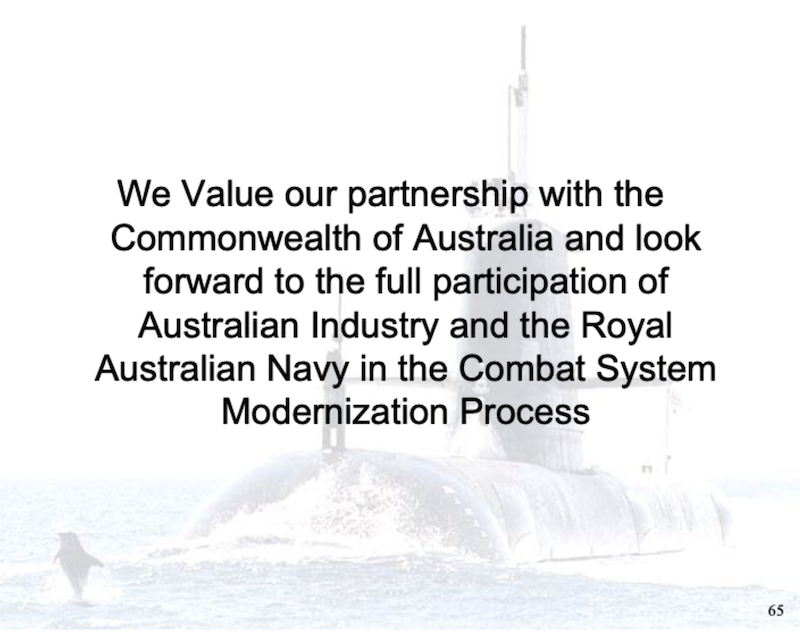 In 2001 Australia entered into a joint submarine Combat System development program with the United States. On Sept 5, 2003 United States Navy Captain David Veatch, Program Manager Submarine Combat Systems, visited Australia to brief Australian industry on a bright joint development program.