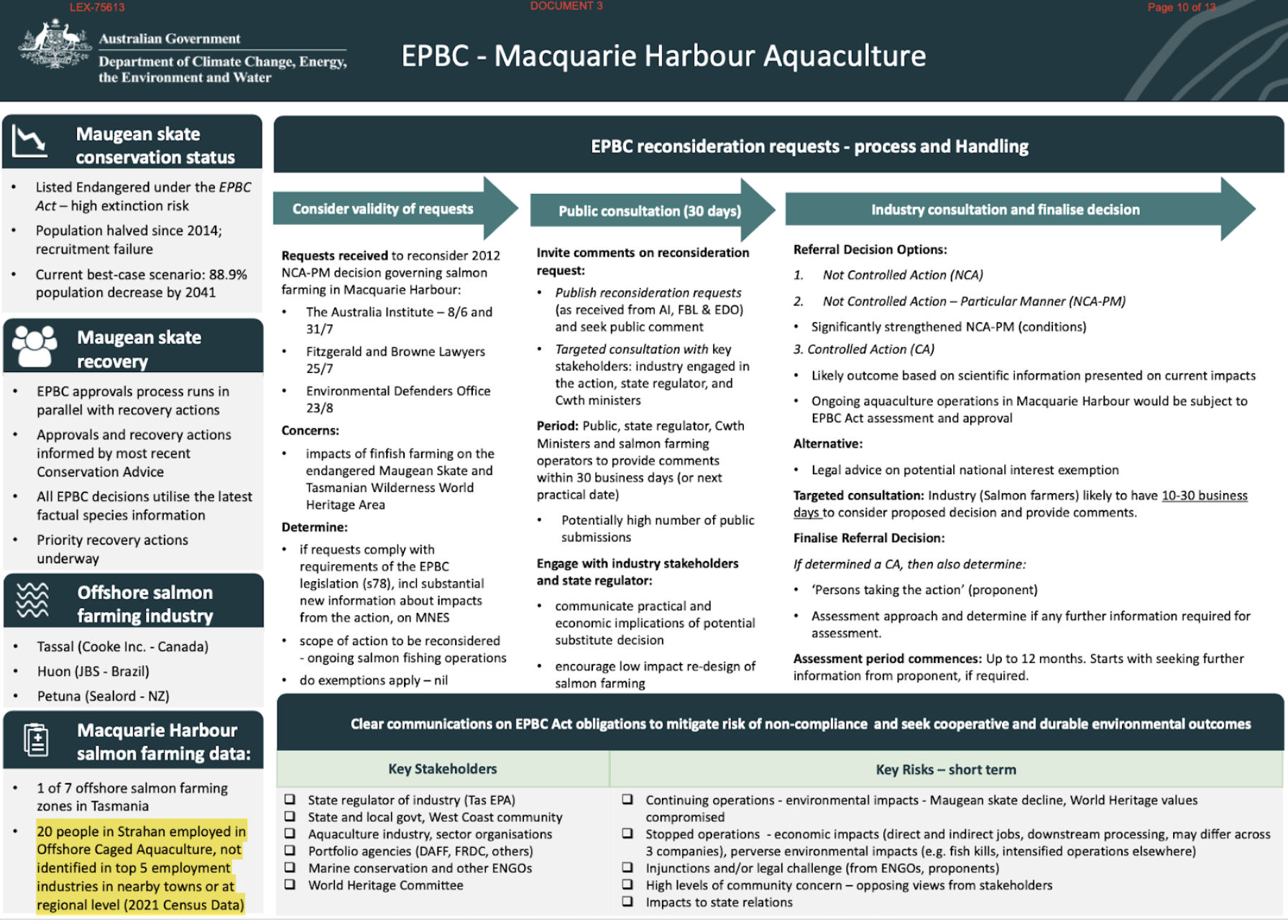 I have been FOI’ing briefs provided to Plibersek on the Salmon farming re-consideration. It’s been like extracting teeth. A fight for a 2023 brief took a year to resolve, and cost the taxpayer more than $50K in lawyers’ fees. The government’s lawyers lost.