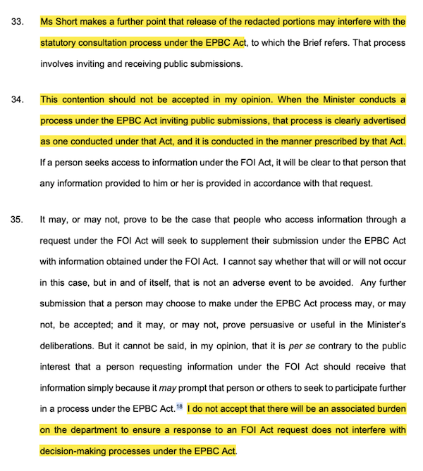 Ms Hush denied access to the document on the basis that the minister still had a decision to make. The preferred position of the Department, and indeed the Government at a political level, is that a fait accompli is presented to the public after the decision is made – and in strict contrast to the objects of the FOI Act mentioned above.