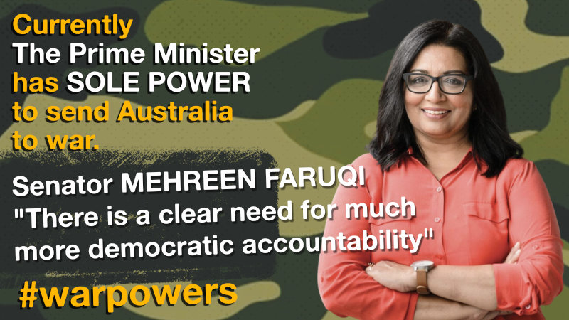 Like other members of her party, Greens senator Mehreen Faruqi supports war powers reform. The senator told MWM that, “There is a clear need for much more democratic accountability and scrutiny of federal government war-mongering. If we really want to forge a path towards peace, then war can never be an instrument to resolve conflict.”