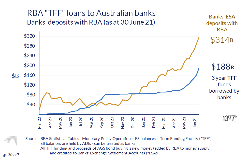 So the new money which the RBA has created to help us out of the pandemic is still there, sitting in the ESAs. It sits there for three years because the banks won’t use it. The banks give the new money back – as well as using new money to pay interest on the TFF loans.