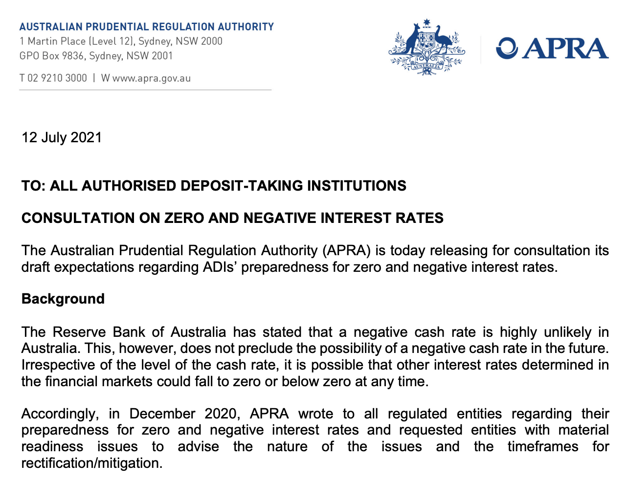 The warning to prepare for negative rates has come via a letter from the prudential regulator APRA; and it reflects a world in flux and renewed uncertainty in Australia. This week’s inflation figures in the US showed an extraordinary 5.4% rise, while, here in Australia, optimism over the incipient post-Covid recovery is being smothered by the NSW outbreak.