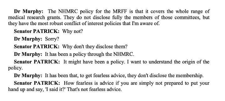 It’s a $20 billion grant fund. It takes applications in secret, assesses them in secrecy and hides from the public exactly who makes the recommendations on who will receive public money. The panel participants that recommended the last grant may well be a recipient of the next grant – nudge, nudge, wink, wink.