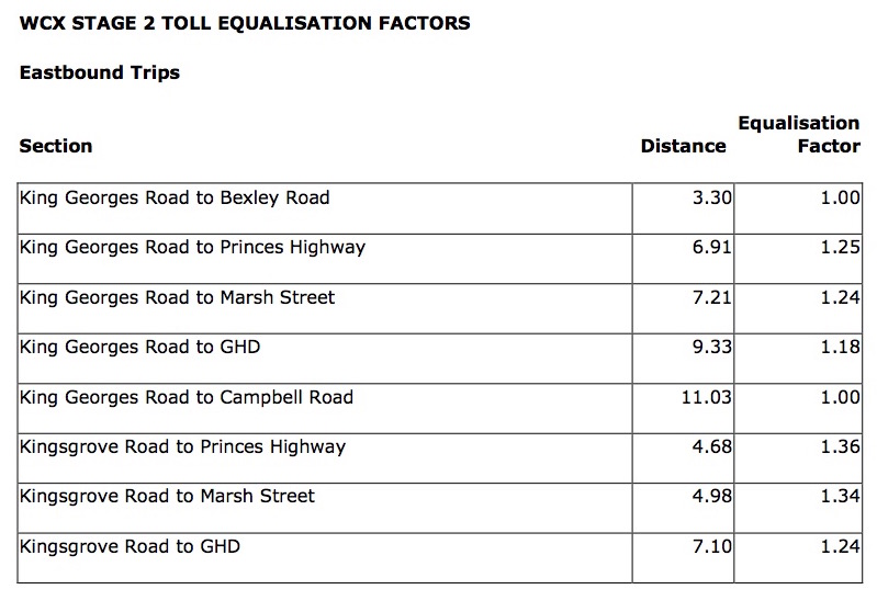 This means the government’s claim of “marginal difference in length” of road does not stack up. For instance, the Kingsgrove to Marsh Street section shows a distance of 4.98k and an Equalisation of $1.34 but the longer section from Kingsgrove to General Holmes Drive of 7.10k shows an EF of $1.24.
