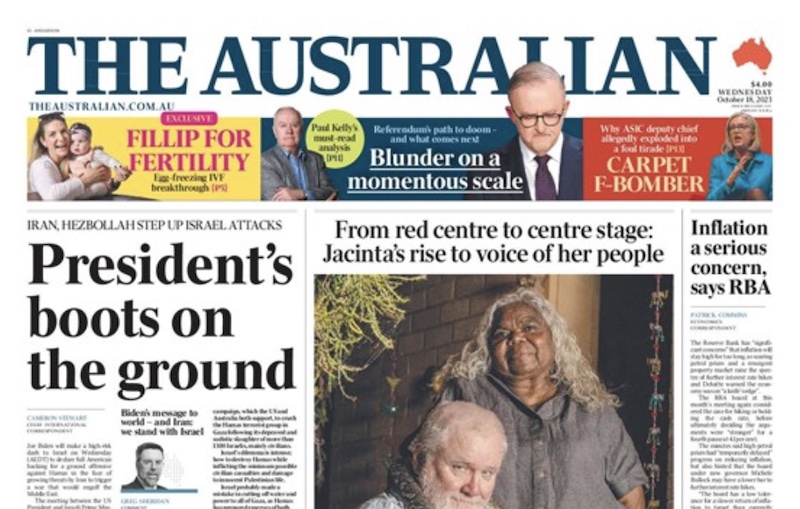 Today, Murdoch’s Australian-government subsidised national broadsheet The Australian and its gallery of old-white-men have anointed Jacinta Price, the face of the No campaign, as the “voice of her people”. As 80% of indigenous Australians – or thereabouts – voted “Yes”, this is confusing. Are not “her people”, Murdoch’s News Corporation and the IPA? Let’s not forget Warren Mundine; Warren is moving on too … no doubt to higher duties in the Murdoch eco-system.