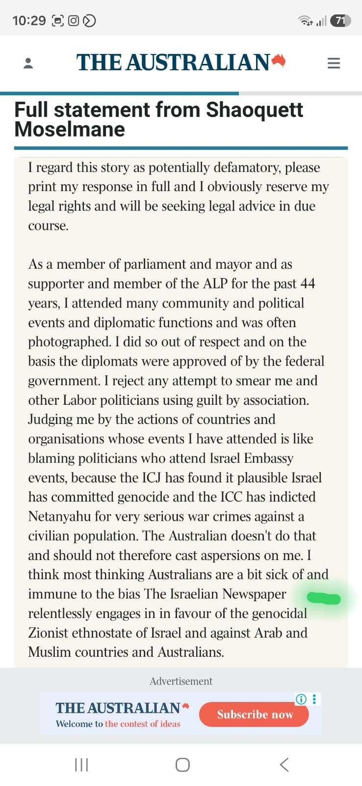 “I think most thinking Australians are a bit sick of and immune to the bias The Israelian newspaper engages in favour of the genocidal ethnostate of Israel,” said a letter from politician Shaoquett Moselmane (screenshot below).